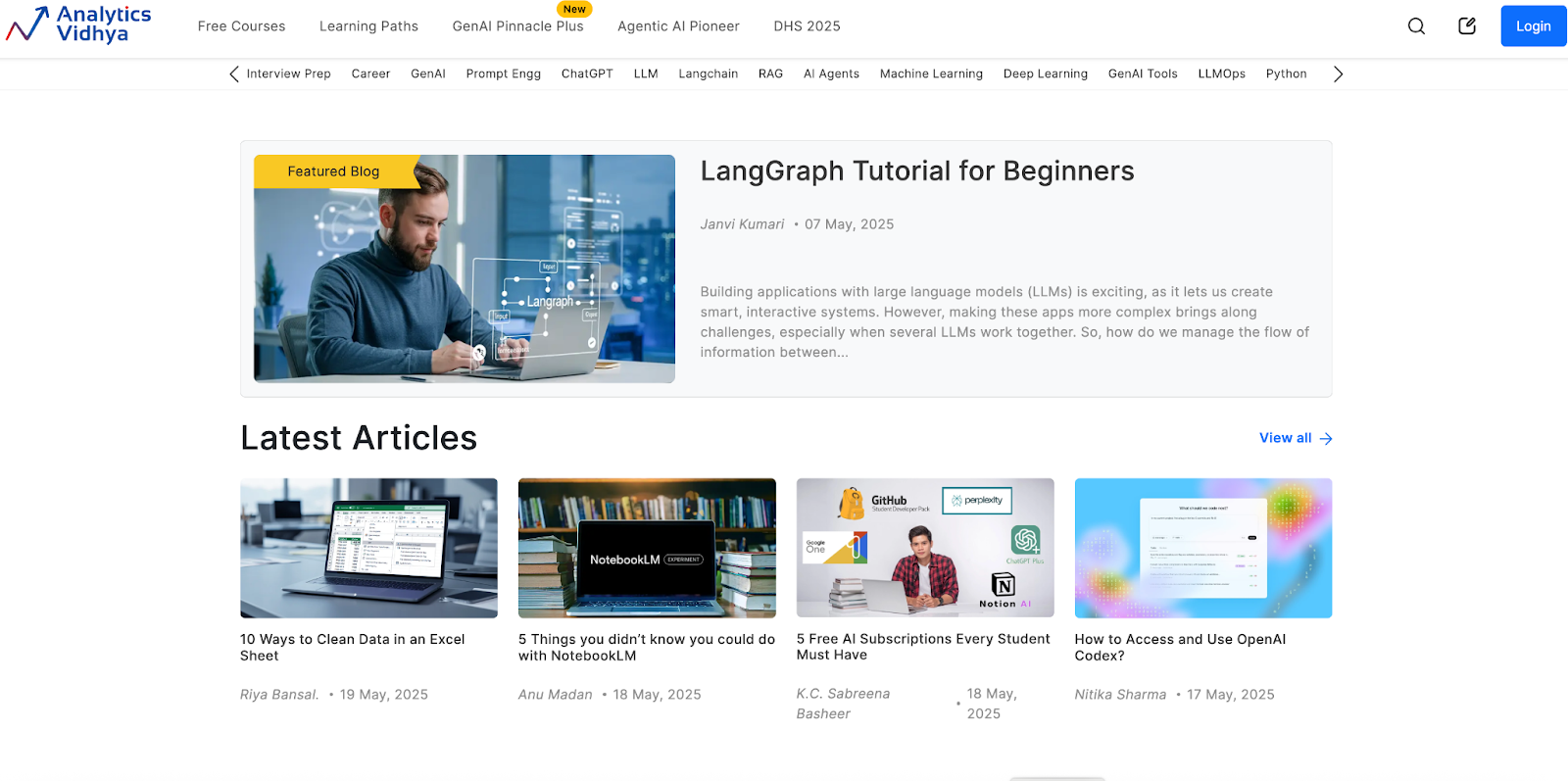 The Analytics Vidhya blog is dedicated to data science, AI, and machine learning. Its goal is to “help build the next generation of AI professionals,” so it offers a wide collection of tutorials, case studies, and coding challenges for those just starting out or established in the field. The team behind the blog also runs an annual DataHack Summit conference. Its content is geared towards beginners all the way to experts. Primary topics include machine learning algorithms, data visualization techniques, AI agents, generative AI, prompt engineering, large language models, and career and interviewing guidance. You’ll want to check out Analytics Vidhya if you’re interested in building out AI and data science skills. It offers hands-on guides and community-driven projects that enable readers to apply their knowledge in real-world scenarios, particularly in predictive modeling and analytics.