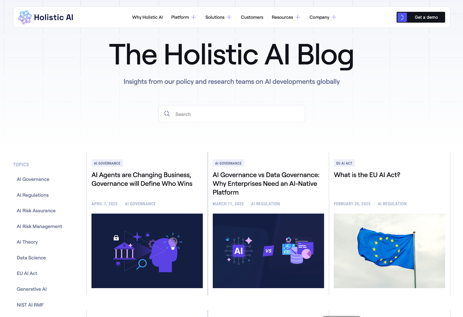 The Holistic AI blog is a leading resource for insights into the development and governance of ethical AI systems, which include AI fairness, accountability, transparency, and risk management. Founded by Emre Kazim and Adriano Koshiyama at University College, London, Holistic AI aims to help companies build and scale responsible AI systems that harmoniously integrate with society. Its content provides expert analyses of the latest regulatory developments, case studies on bias mitigation, webinars, research papers, and best practices for deploying AI responsibly across various industries. With a strong emphasis on building trustworthy AI, the blog is a valuable tool if you are interested in or work in AI policy and are committed to aligning AI technologies with ethical standards.
