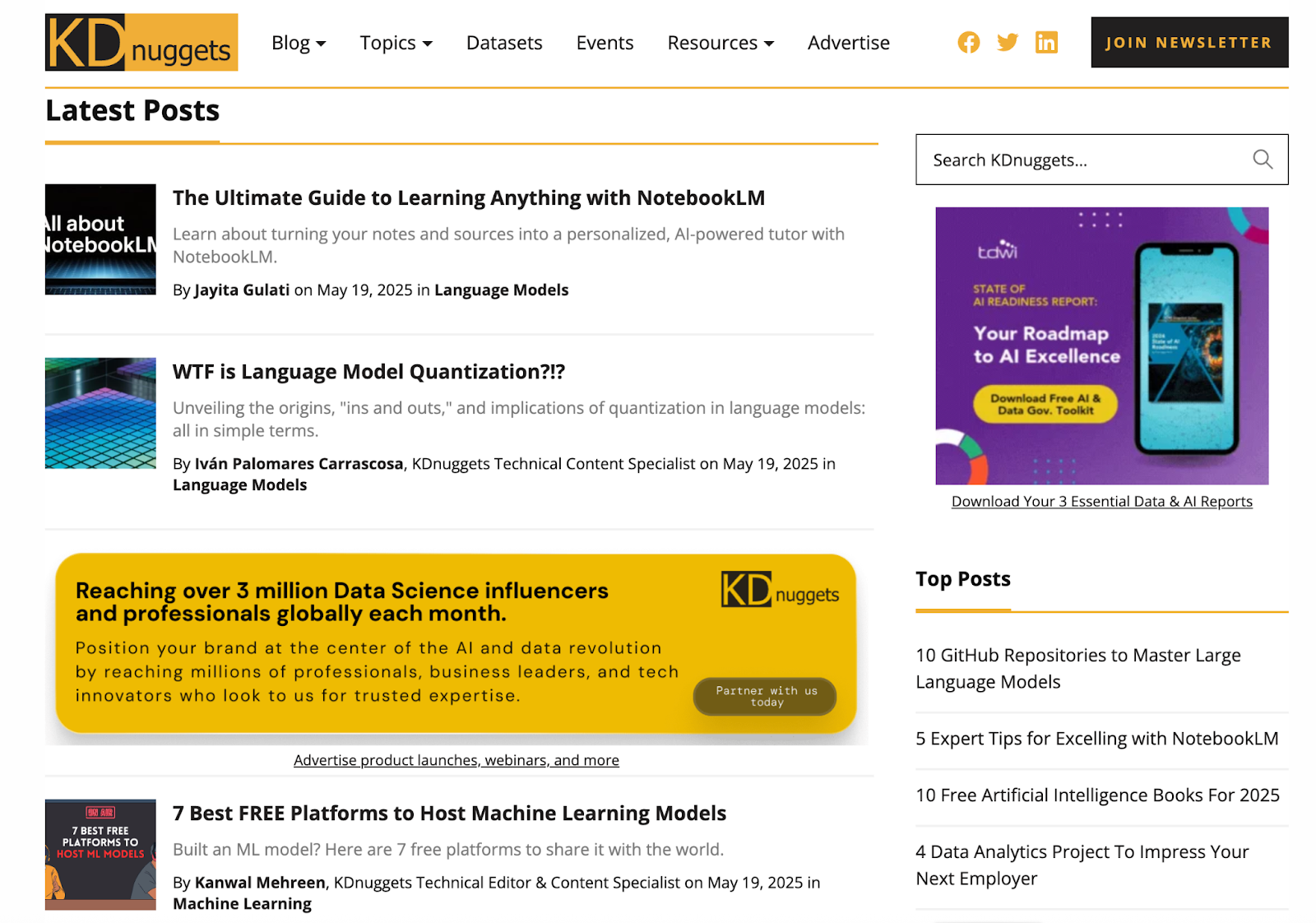 KDnuggets (KD stands for “knowledge discovery”) is a resource for data science, machine learning, and AI professionals. It offers a range of tutorials, industry news, and expert insights. Founded by Dr. Gregory Piatetsky-Shapiro, a leading expert in data mining and machine learning, KDnuggets has over two decades of continuous publication. It covers language model updates, data privacy in the age of AI, computer vision, natural language processing, machine learning operations (MLOps), and data engineering. It also has a variety of content on data science and machine learning career advice, including job hunting tips, skills to have, and how to build out your portfolio. Its regular contributors include in-house editors and guest authors who provide you with information about the latest tools, trends, and developments in the field.