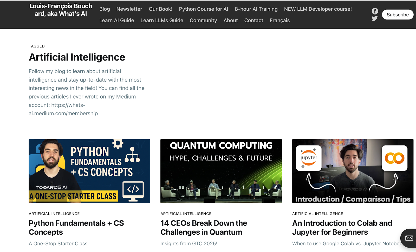 The What’s AI blog from Louis Bouchard is an ideal resource if you’re just starting to get into the field of AI and machine learning. Comprised of videos and blog posts, you’ll find a variety of content focused around AI education, coding, industry trends, and career advice. Although Bouchard does focus a lot on large language models, you can also find content on retrieval-augmented generation (RAG), AI developer toolkits, how AI will affect certain industry sectors, and AI podcast interviews with experts in the field. All the content on this blog is created by Bouchard himself with the goal of helping AI become more accessible to enthusiasts and professionals in the field.