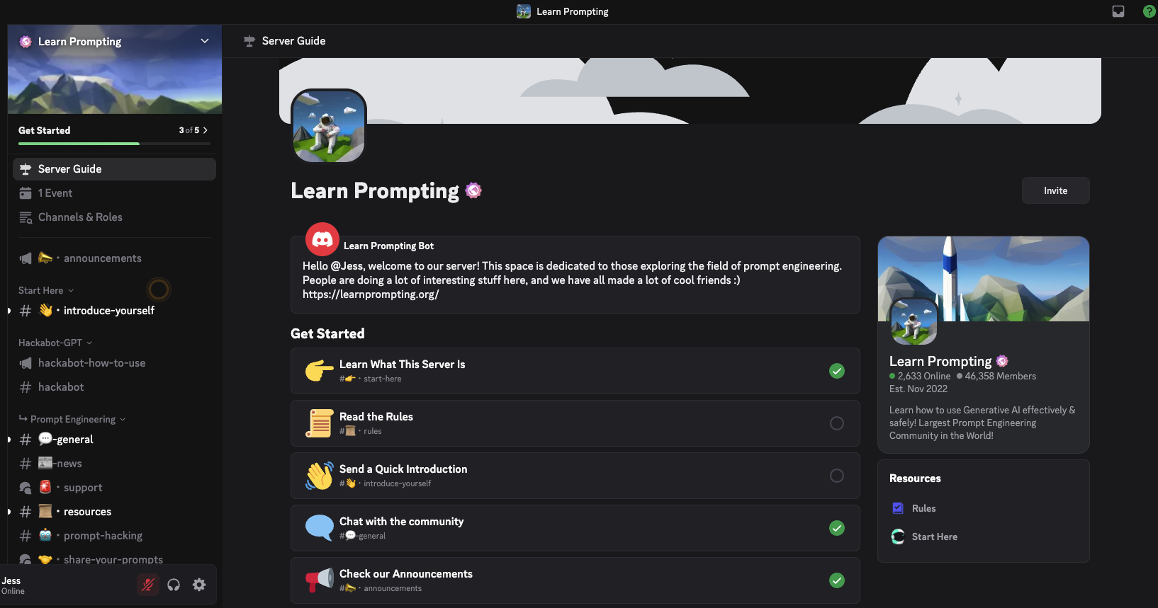 Sander Schulhoff and Fady Yanni created the Learn Prompting community to help ChatGPT users maximize their outputs and build better AI prompt documentation. This server is designed for prompt engineering enthusiasts and professionals. Its main goal is to help you learn more about prompt engineering, find valuable resources, and discuss the latest AI news. It also includes dedicated channels for community updates, support questions, job postings, and self-promotion.