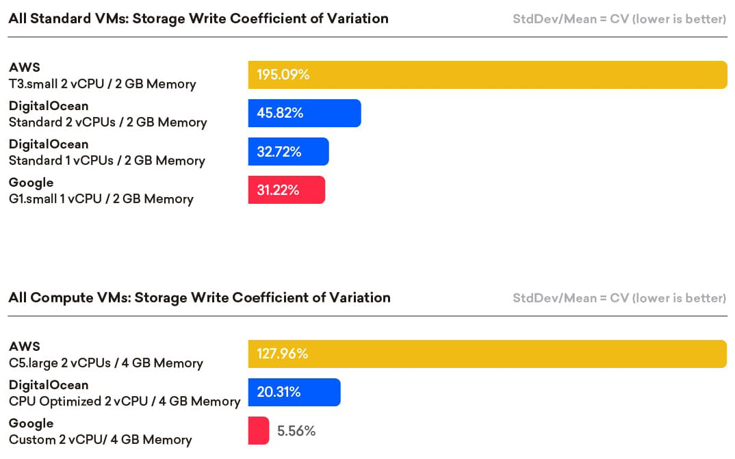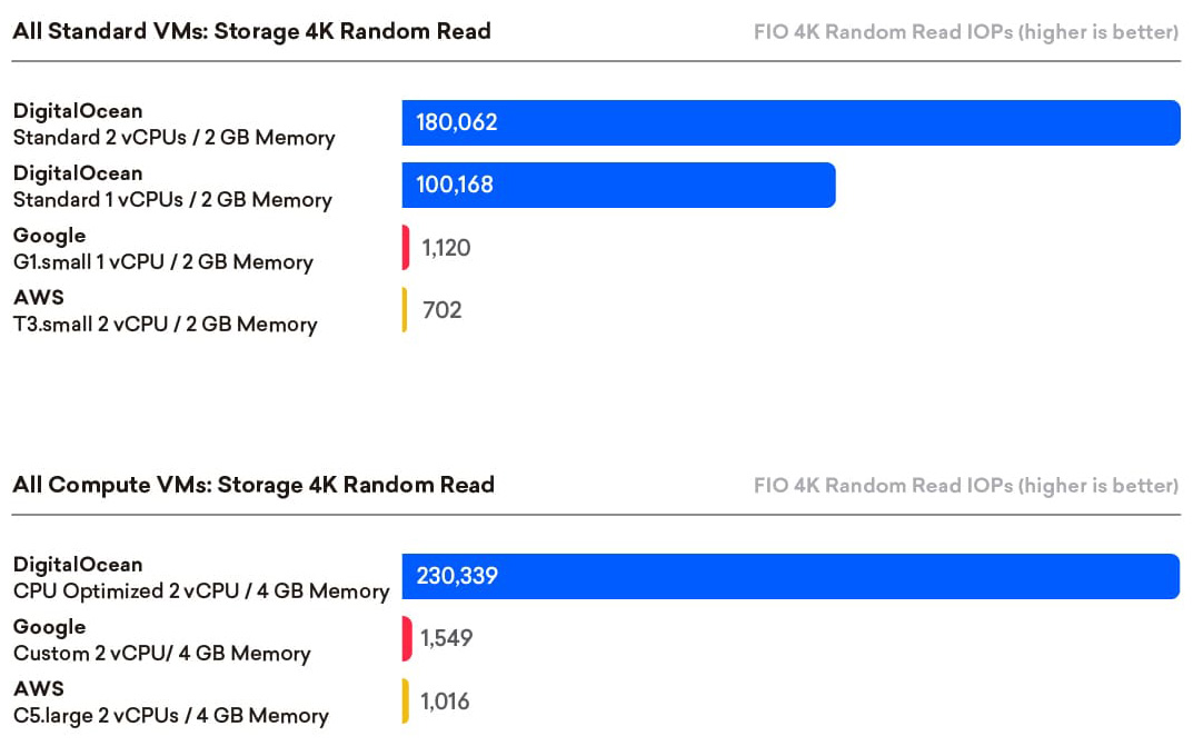 In summary, DigitalOcean provides excellent storage price-performance for both read and write for all VM configurations tested, regardless of machine classification or size.