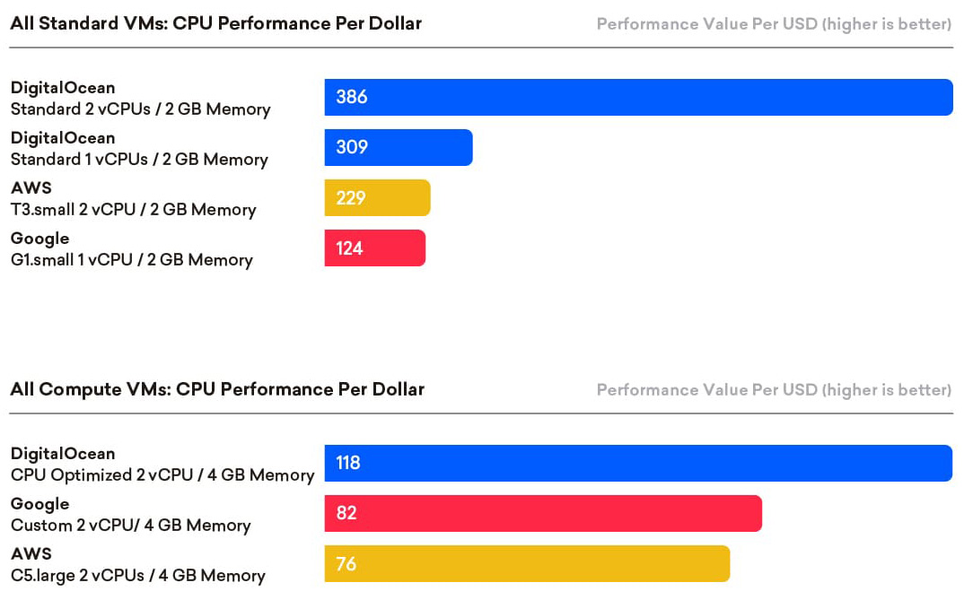 DigitalOcean commissioned Cloud Spectator to evaluate the performance of virtual machines (VMs) from three different Cloud Service Providers (CSPs): Amazon Web Services, Google Compute Engine and DigitalOcean. Cloud Spectator tested the various VMs to evaluate the CPU performance, Random Access Memory (RAM) and storage read and write performance of each provider’s VMs. The purpose of the study was to understand Cloud service performance among major Cloud providers with similarly-sized VMs using a standardized, repeatable testing methodology. Based on the analysis, DigitalOcean’s VM performance was superior in nearly all measured VM performance dimensions, and DigitalOcean provides some of the most compelling performance per dollar available in the industry.